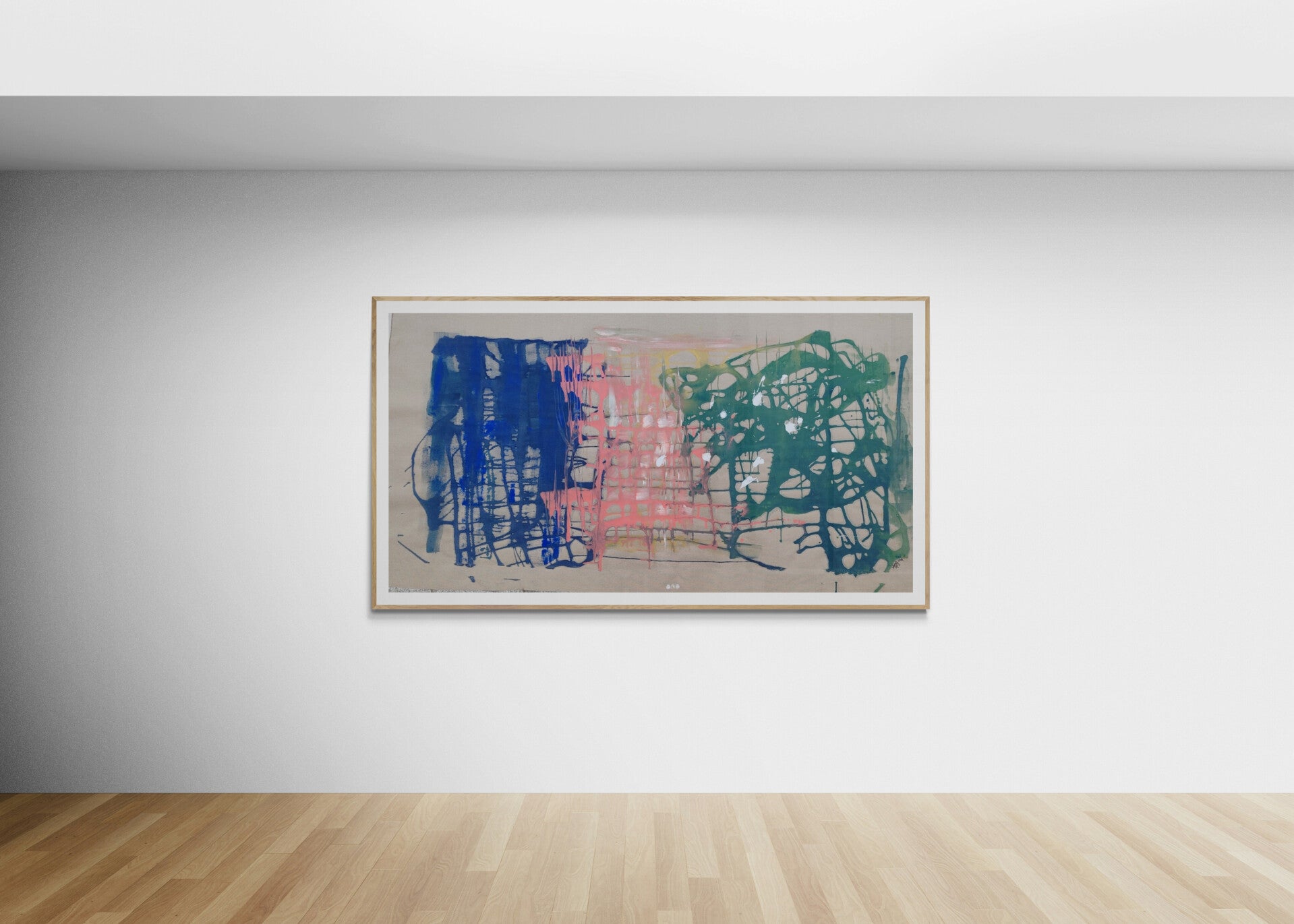 The canvas, raw, unsized, and unprimed, offers a tactile connection to the natural world, amplifying the organic energy of the piece. Its dimensions (219cm x 111cm) make it a striking centerpiece, ideal for a large living room, office, or even exterior spaces.