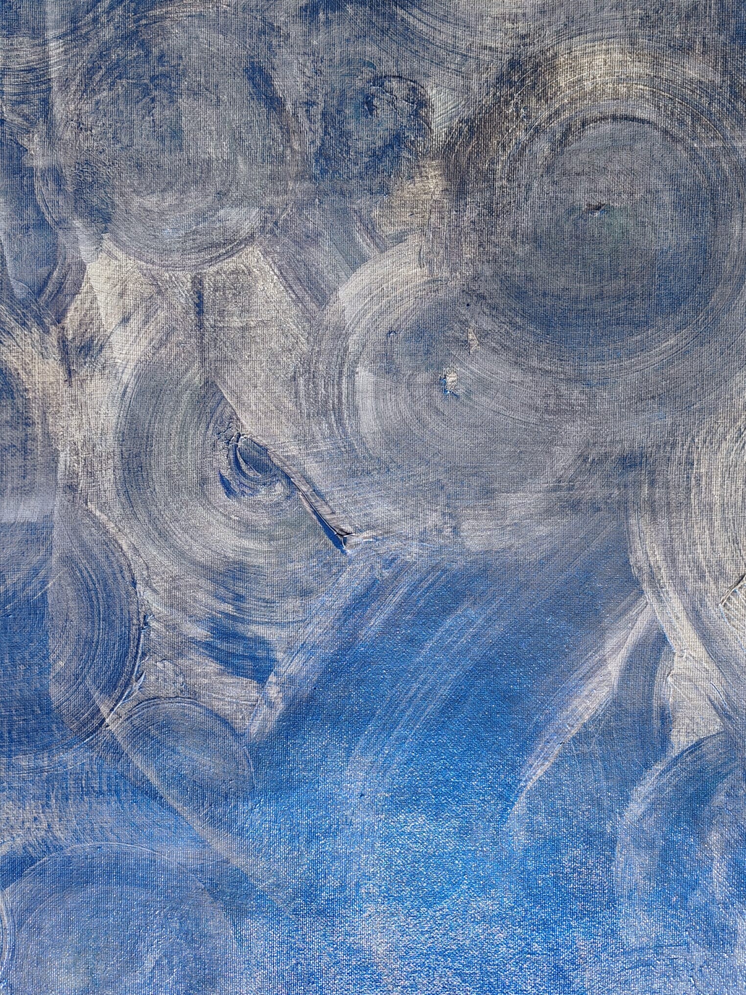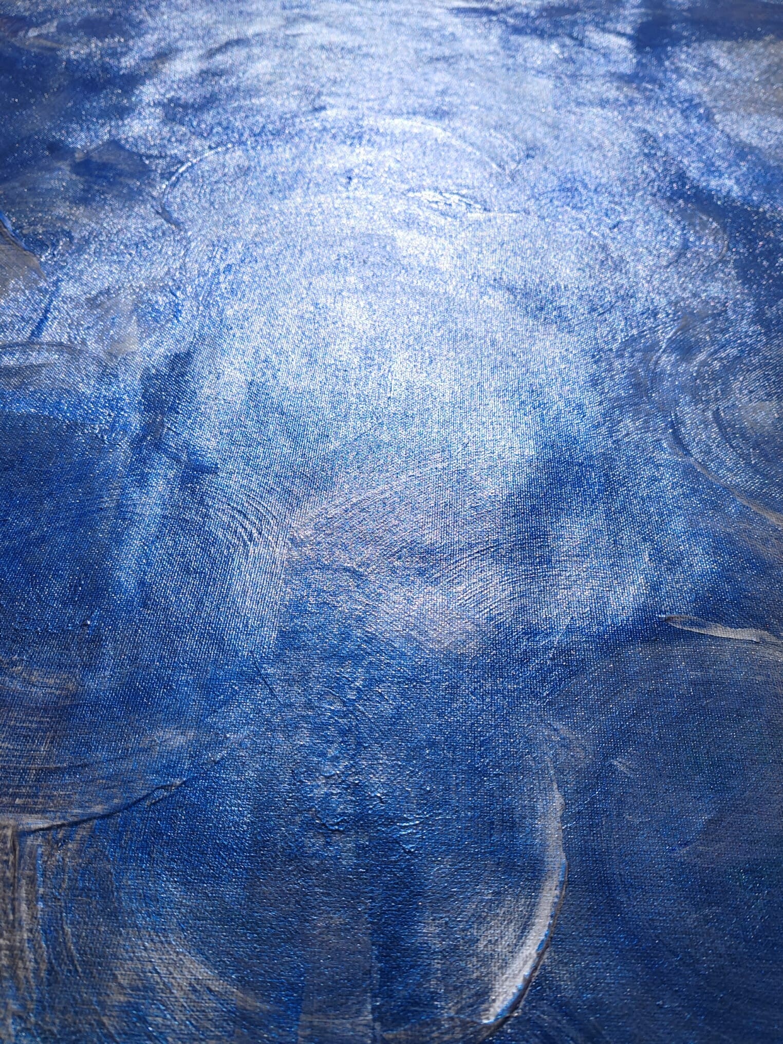 "Blue Celestial" (107cm x 107cm) is part of the Blue Collection: Breaking Stereotypes, where blue is redefined as a force of transformation. This iridescent artwork shifts between deep celestial blue and black mars, changing with the light—just like perceptions evolve when we challenge expectations.