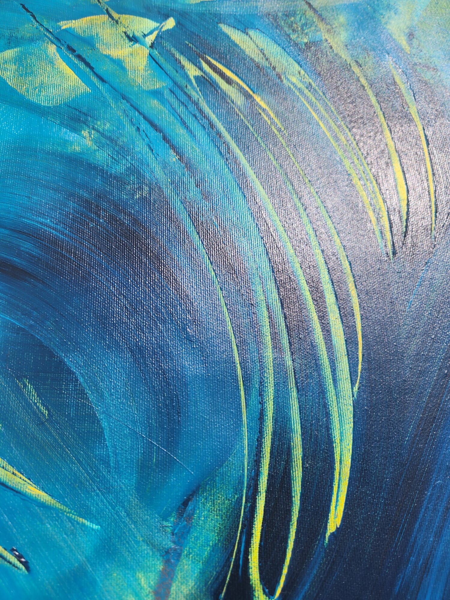 The yellow base symbolizes the dawn of new beginnings, a radiant foundation from which strength emerges. As the layers of blue brush over, they reveal the complexity of growth—both turbulent and tranquil, like waves crashing upon the shore yet retreating to reveal smoother sands.